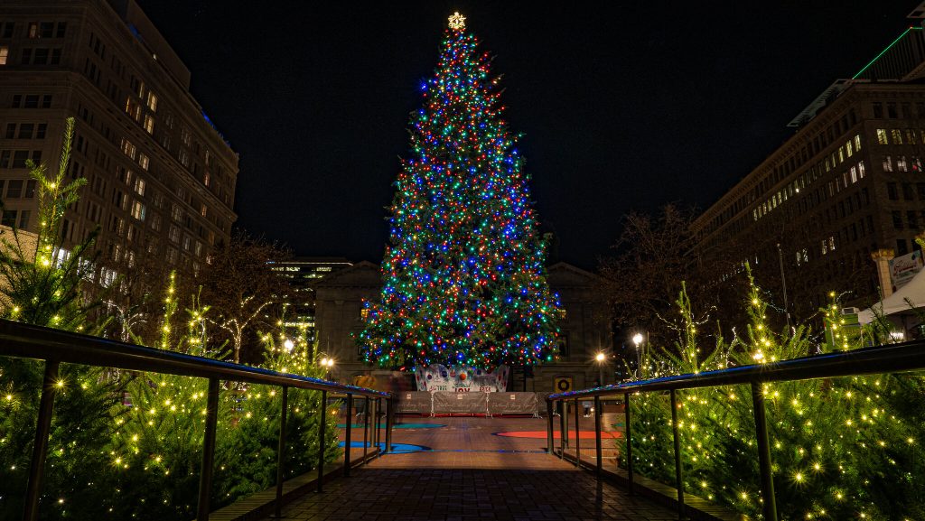 Pioneer Courthouse Square (often referred to as Portland’s Living Room) comes alive during the Christmas season. The square, located in the heart of downtown Portland, transforms into a festive hub of activity and celebration. One of the most iconic features is the enormous Christmas tree, adorned with thousands of dazzling lights, which serves as a focal point for the city’s holiday festivities. Throughout the holiday season, Pioneer Courthouse Square hosts a variety of events, from the annual tree lighting ceremony that draws crowds of excited onlookers, to holiday markets where visitors can shop for unique gifts and festive treats for friends and family members (or maybe even yourself?)